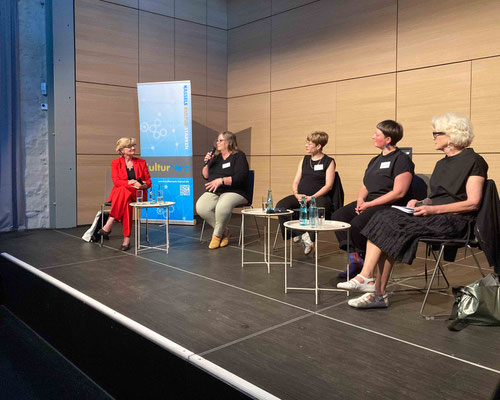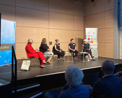 Bei „Neue Gesichter der Kultur“ saßen am 02.09.2025 Julia Blando (kuratorische Geschäftsführung) und Maya Alou (stellvertretende kuratorische Geschäftsführung der Stiftung Brückner-Kühner), sowie Helen MacCormac (2. Vorsitzende Literaturhaus Kassel) auf dem Podium.